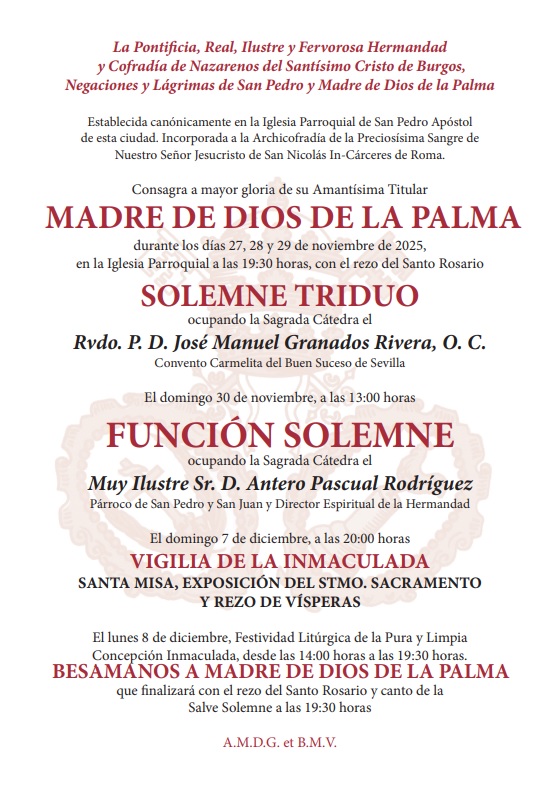 Los días, 27, 28 y 29 de noviembre, solemne triduo a Madre de Dios de la Palma, dando inicio a partir de las 19.30 horas con el rezo del santo rosario y posterior eucaristía presidida por el Rvdo. Padre D. José Manuel Granados Rivera O.C., de la comunidad de los carmelitas del Buen Suceso.
